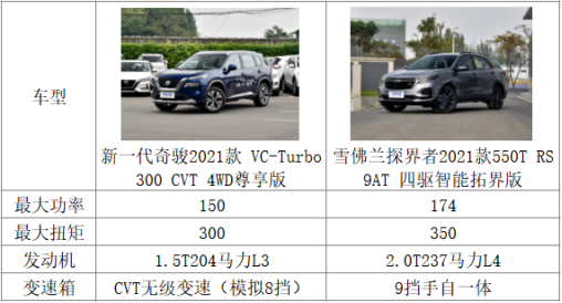 新一代奇骏2021款 VC-Turbo 300 CVT 4WD尊享版,官方售价23.29万元雪佛兰探界者2021550T RS 9AT 四驱智能拓界版市场指导售价22.99万元(经销商参考价18.39万)。新奇骏到底有没有优势?下面就让我们从动力、安全以及性价比等各个方面来聊聊。
