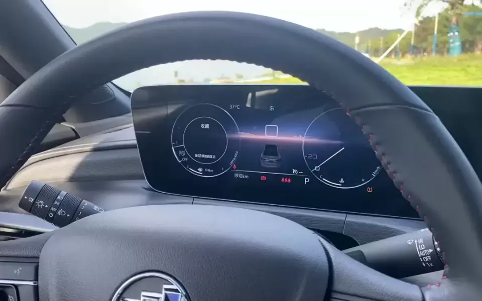 整个内饰同样以黑色为基调,搭配红色缝线,视觉重心则是那块悬浮式双联屏,全液晶仪表盘和中控屏都是10.25英寸的彩屏,以深色为底的界面科技感很强,其中全液晶仪表更是提供两种界面风格和全地图模式。